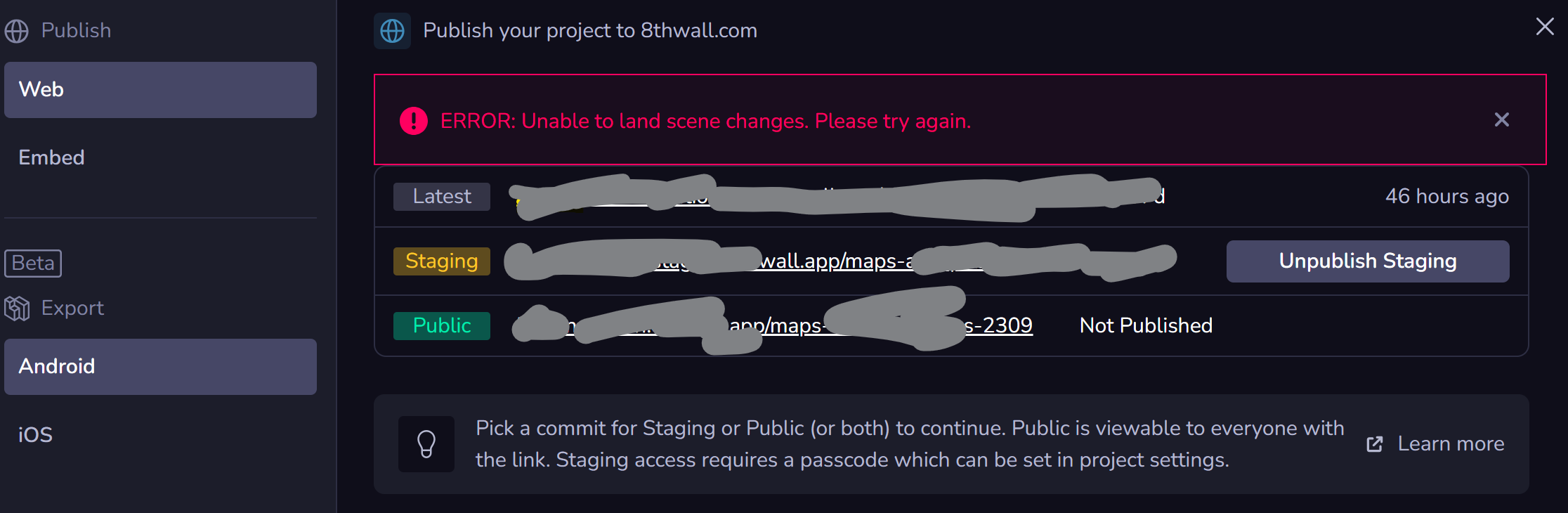 Hi there, I have made some changes to a project but when trying to land those changes it is not working as expected. The Land is still solid green and when I go into the PUBLICH section I have the following error message.