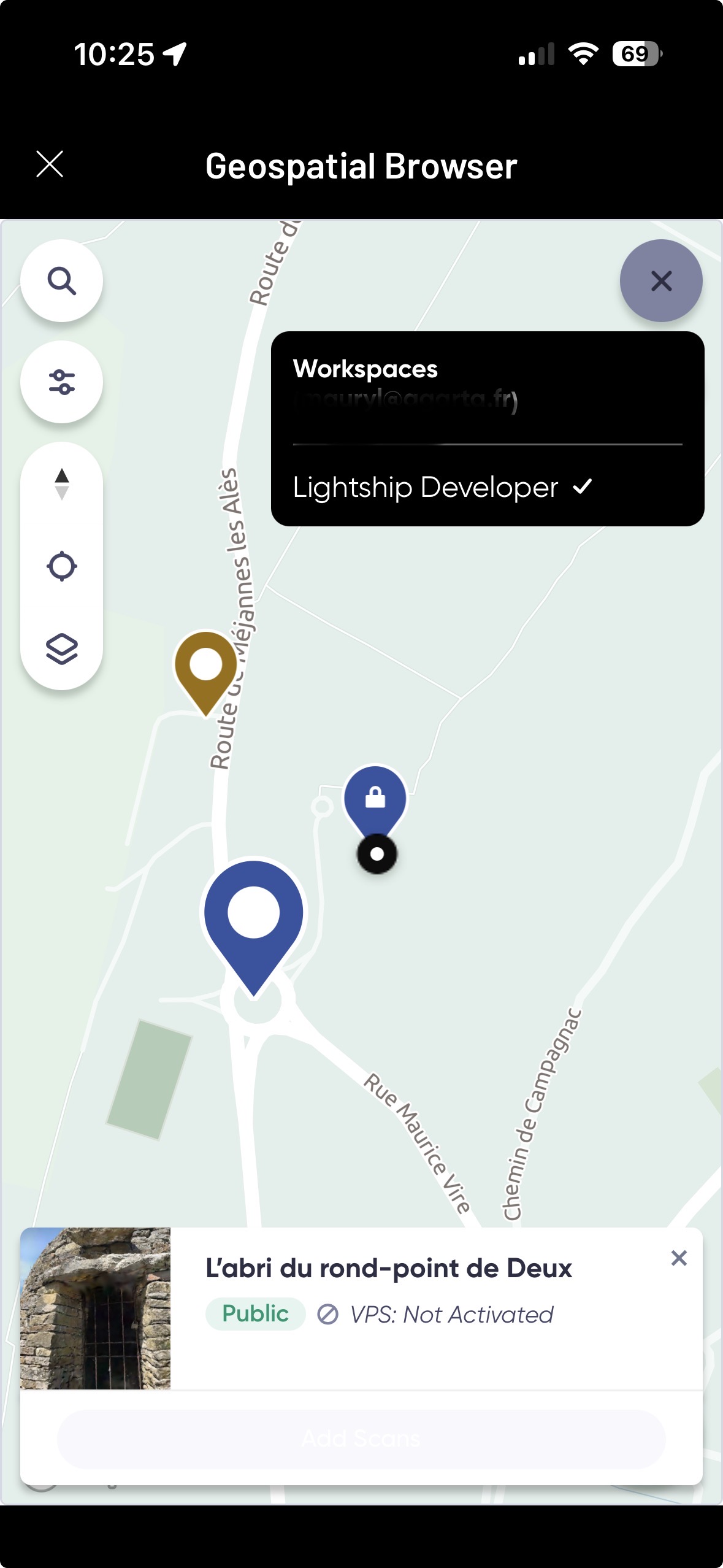 I’ve then scanned the QR code from the desktop webpage of the GSB and it appear that I am not connected anymore, because the name of the workspace is now back to “lightship developer” (which is not the same as my 8th wall account).